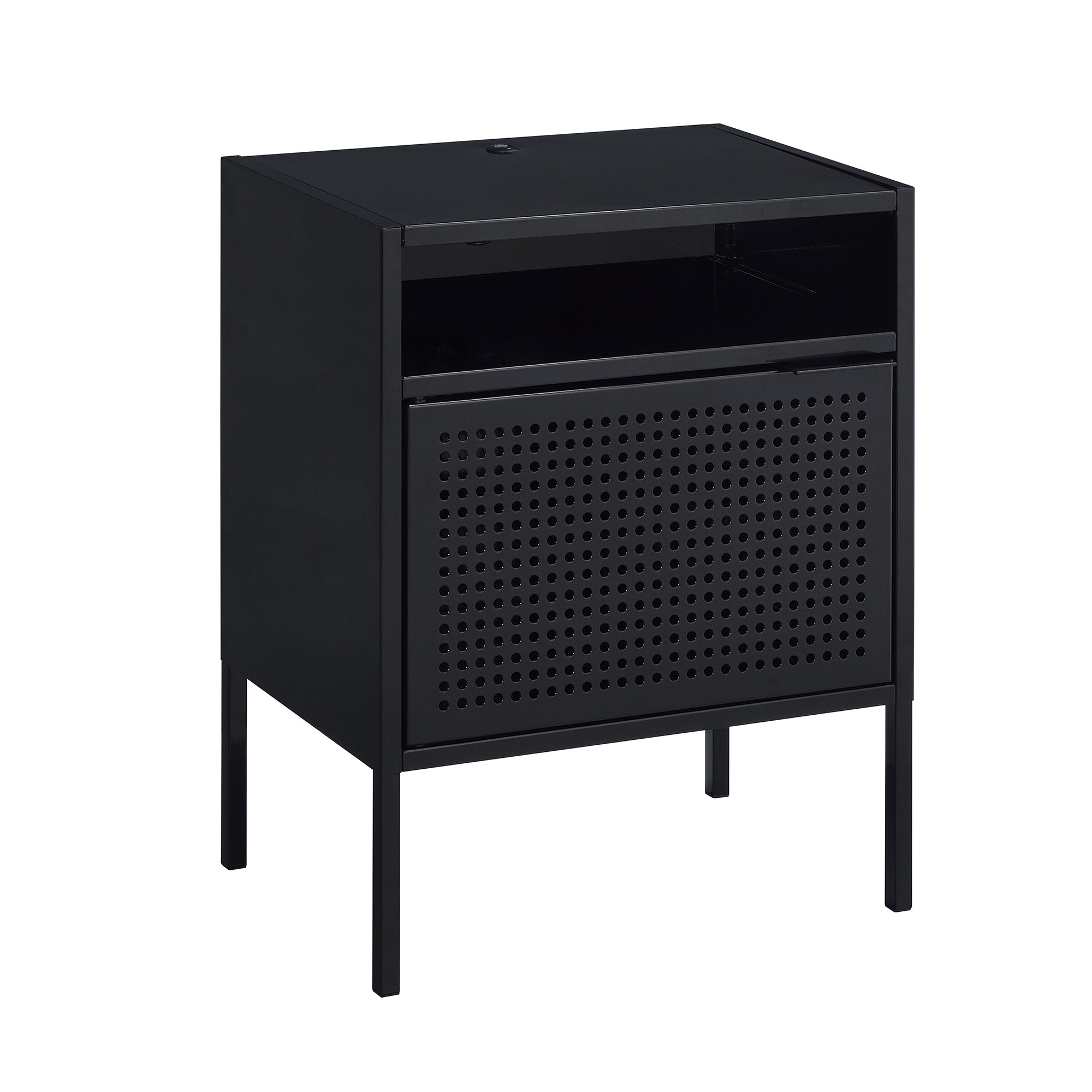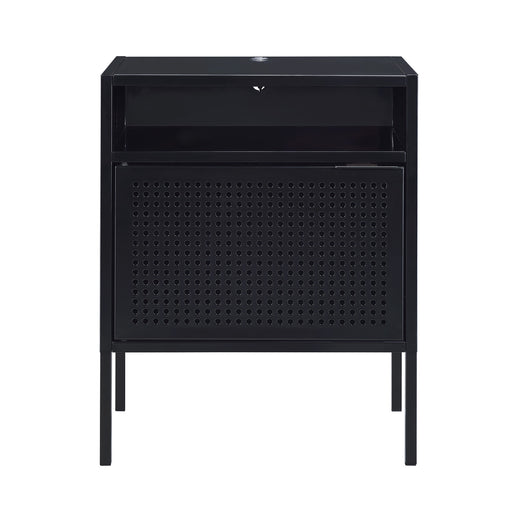 The Ember Nightstand is a quick and simple way to update any room! This table can be used as a nightstand or as an accent table in your living room. You can even keep your devices charged while you binge watch your favorite show or while you sleep. Thanks to the multiple color options, youre sure to find a color that goes great in your home! The table is made of metal and features an open shelf space as well as a cabinet to store away your belongings. Features: • USB Port • Open Shelf • Large, Spacious Cabinet • Multiple Color Options • Made of Metal • Transitional Design Dimensions: Depth: 13.0" x Width: 19.0" x Height: 24.0" Weight: 16.0 lbs.