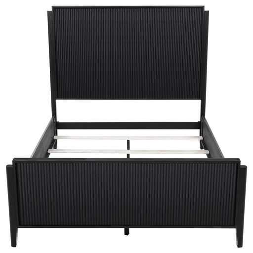 A rich black finish create a sophisticated palette for a four-piece modern bedroom set. Complete with wire brushing that creates texture, the set f...