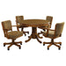 Perfect for an entertainment room or versatile space, this five-piece dining set is all fun and games. Enjoy a morning cup of coffee by day and poker or bumper pool by night with the three-in-one table top. Completely classic, this Craftsman-inspired set features a light and warm hue. Including four arm chairs and pool sticks and balls, the solid oak construction is relaxed with delicate curves and carvings. Full of plush cushions and casters, the comfortable chairs boast hours of entertainment.
