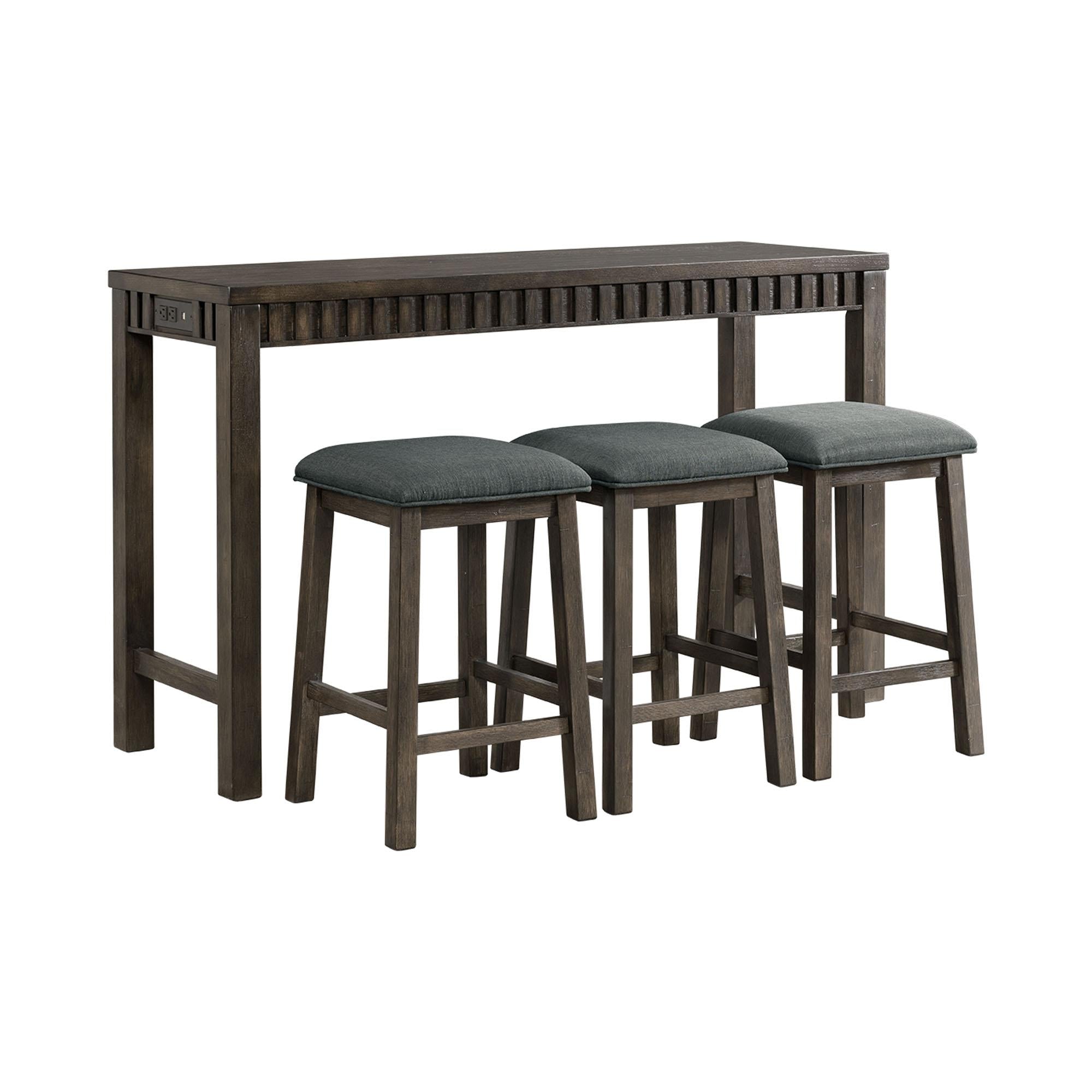 The Shelter Bay Multipurpose Bar Table Set is the ultimate set for your home! This set can be placed anywhere in your home, from a kitchen nook to a spot behind the sofa in the living room. Keeping your devices charged while you work wont be a problem, thanks to the USB ports and power strip located on the side of the table. The barstools comes with an upholstered, foam cushion seat; making it easy to watch your favorite TV shows while you work without having to completely rearrange the couch to get you setup to finish up extra work. The dark walnut finish, will pair perfectly with any existing decor you have. Say goodbye to having to haul your work to your local coffee shop and hello to the Shelter Bay Multipurpose Bar Table Set! - Multipurpose Bar Table Set - Includes: Table and Three Bar Stools - USB Ports - Power Strip - Ships in One Box - Upholstered Seats - Gray Fabric - Straight Legs - Stretchers along Barstools - Piping along Seat Cushions - Dark Walnut Finish Acacia Solid Wood MDF Top Oak Veneer Rubberwood Plywood D x W x H, 81lbs. 1 Year Limited Manufacturer Warranty