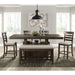 Elements Colorado Counter Height Bench in Charcoal DCO100CBN. The Colorado Counter height dining collection, brings boldness to a casual dining scheme. With a trestle base design and a deep finish, this everyday counter height table serves as a perfect gathering space. Enjoy an attractive chevron design on its table top while accommodating deep chairs and extra storage. The inventive table design creates options for positioning to suite your needs. The slat back design of the chair and the black hardware finishes, reflect a design-forward blend of modern and farmhouse concept.