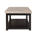 The Kansas Coffee Table with Marble Top is the perfect addition to your home! This coffee table features a marble table top, making it the perfect piece for your living room. The base features a bottom shelf, allowing you to store away your favorite d- cor or coffee table books. The base of the table is finished in a rich, espresso; making it the perfect transitional color for your home. The straight legs keep this contemporary design a staple in your home year after year. - Marble Table Top - Bottom Shelf - Espresso Finish - Straight Legs - Contemporary Design - Rectangle Design Marble Table Top MDF & Birch Veneer Butt Joint Cleat/Dowel/Corner Blocked Connection 26 D x 48 W x 19 H, 105lbs. 1 Year Limited Manufacturer Warranty