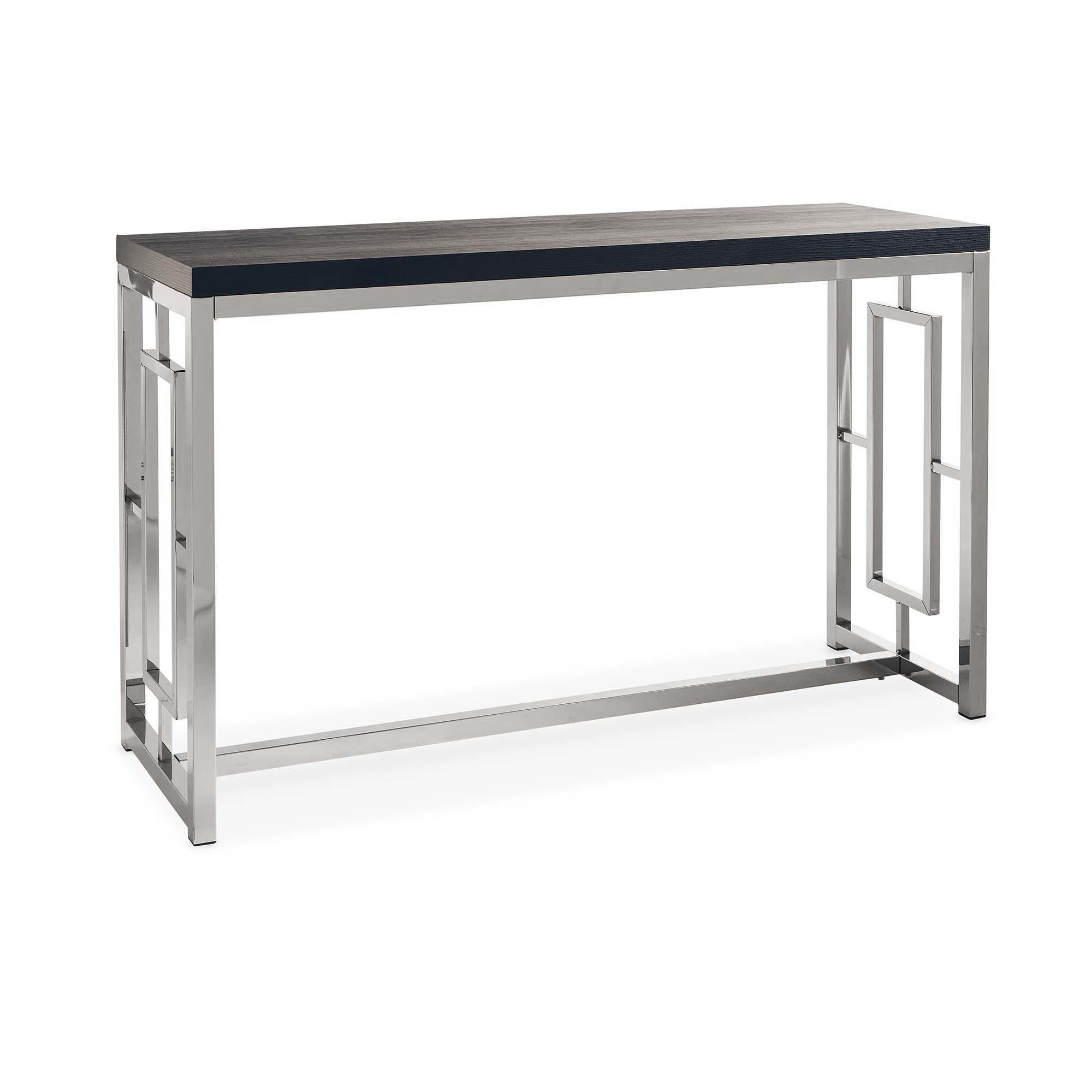 The Ezra Sofa Table is modern glam at its best! This rectangular table will look great behind the sofa, or even in an entryway. This table features a black table top that pairs beautifully with the chrome finish and will also pair with any existing decor and furnishings you already have. The sides of the sofa table feature an intricate design adding extra flair to this already stylish accent table. Adding this accent staple piece to your home will instantly add style and glam, a look youll never get tired of. - Rectangle Sofa Table - Chrome Finish - Black Table Top - Intricate Design on Outer Legs - Modern Glam Design - Stretcher Base Particle Board Metal 16 D x 48 W x 29 H, 37lbs. 1 Year Limited Manufacturer Warranty