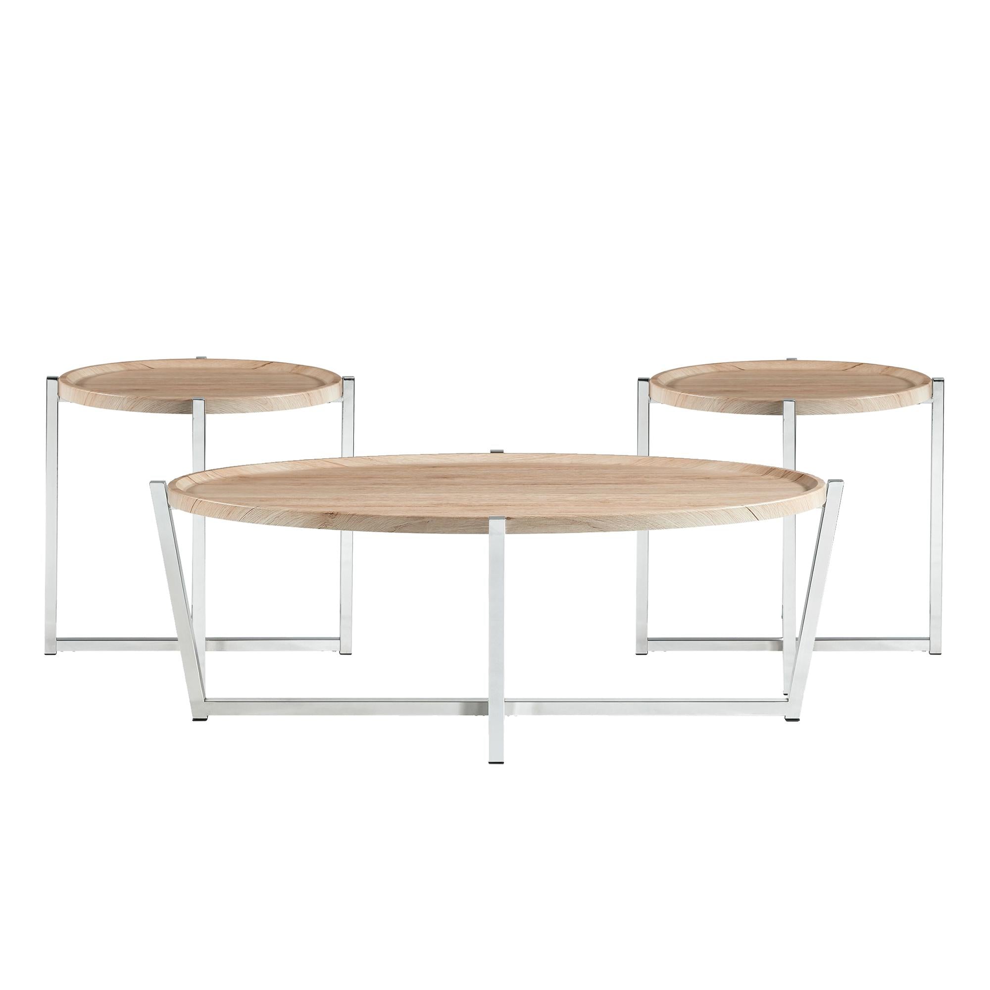The Landry 3PC Occasional Table Set will look fantastic in your living room! This set includes a coffee table and two end tables, easily setting up the perfect combo for your home. The table tops feature a tray-like design ensuring items will stay in their place. The metal base is coated in a chrome finish, adding extra style to this already stylish trio. The intricate table base will easily adds extra flair to this transitional style. Add this accent table set to your home today for a look that will never go out of style! - Includes: Coffee Table and Two End Tables - Tray Style Table Tops - Chrome, Metal Base - Light, Natural Finish on Table Tops - Intricate Table Base - Transitional Style MDF Metal D x W x H, 60lbs. 1 Year Limited Manufacturer Warranty