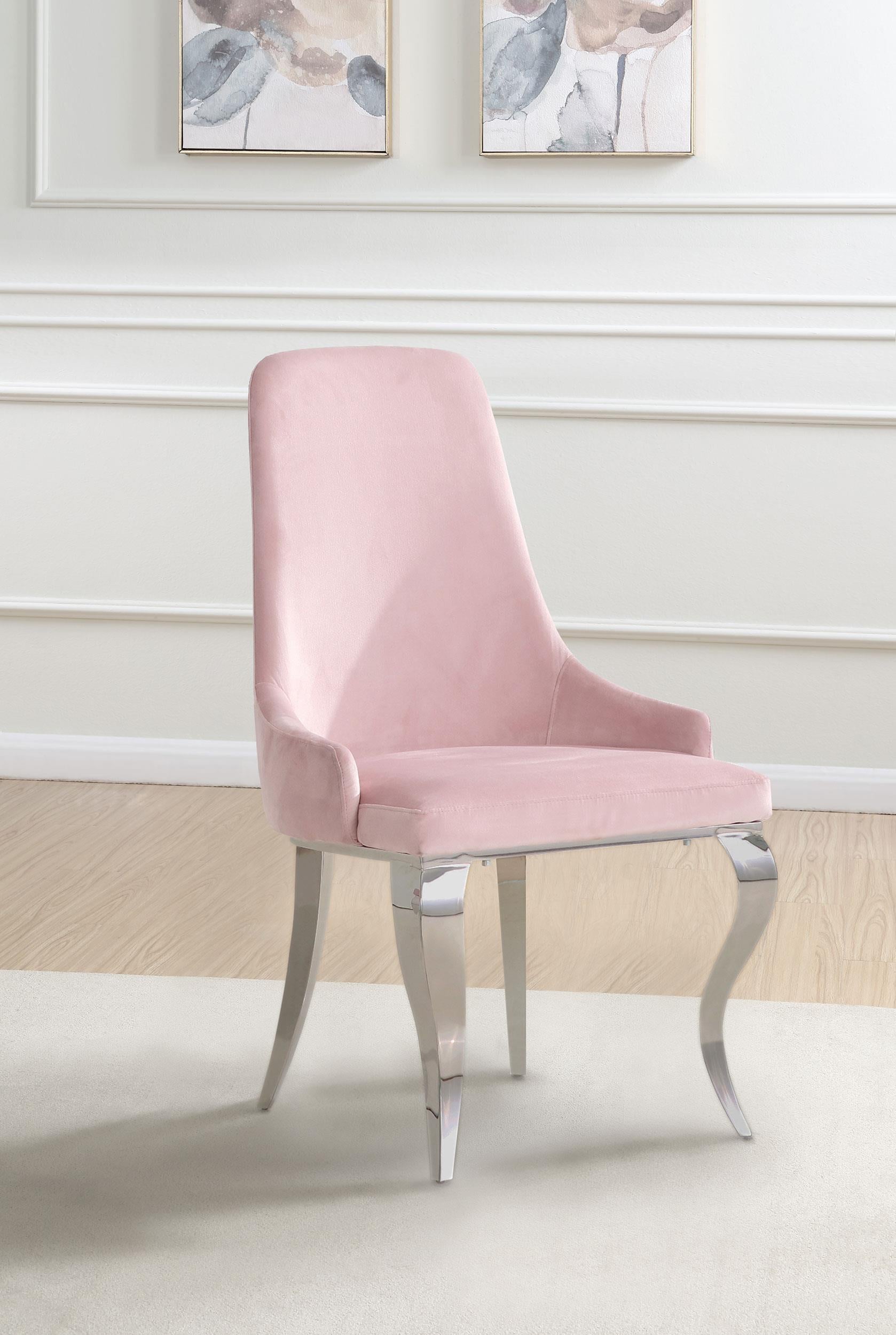 Immerse yourself in the epitome of elegance and comfort with this upholstered dining chair. Draped in soft velvet, the tailored wingback and demi-arm silhouette offer a plush slipper-style seat ideal for formal dinners and long conversations. Cabriole-shaped legs in ultra-polished electroplated chrome provide sleek contrast to the velvety texture. Expertly crafted from stainless steel, this side chair blends refined curves and upscale materials with enduring support and sophistication.