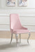 Elevate your dining space with the luxurious charm of this upholstered side chair. Wrapped in soft light pink velvet fabric, it features a graceful slipper-style silhouette with a high back and demi arms for added elegance. The sculptural cabriole legs, crafted from polished stainless steel, provide a striking contrast and modern appeal. Designed for both comfort and style, this chair is perfect for formal dining rooms, chic lounge spaces, or sophisticated accent seating.