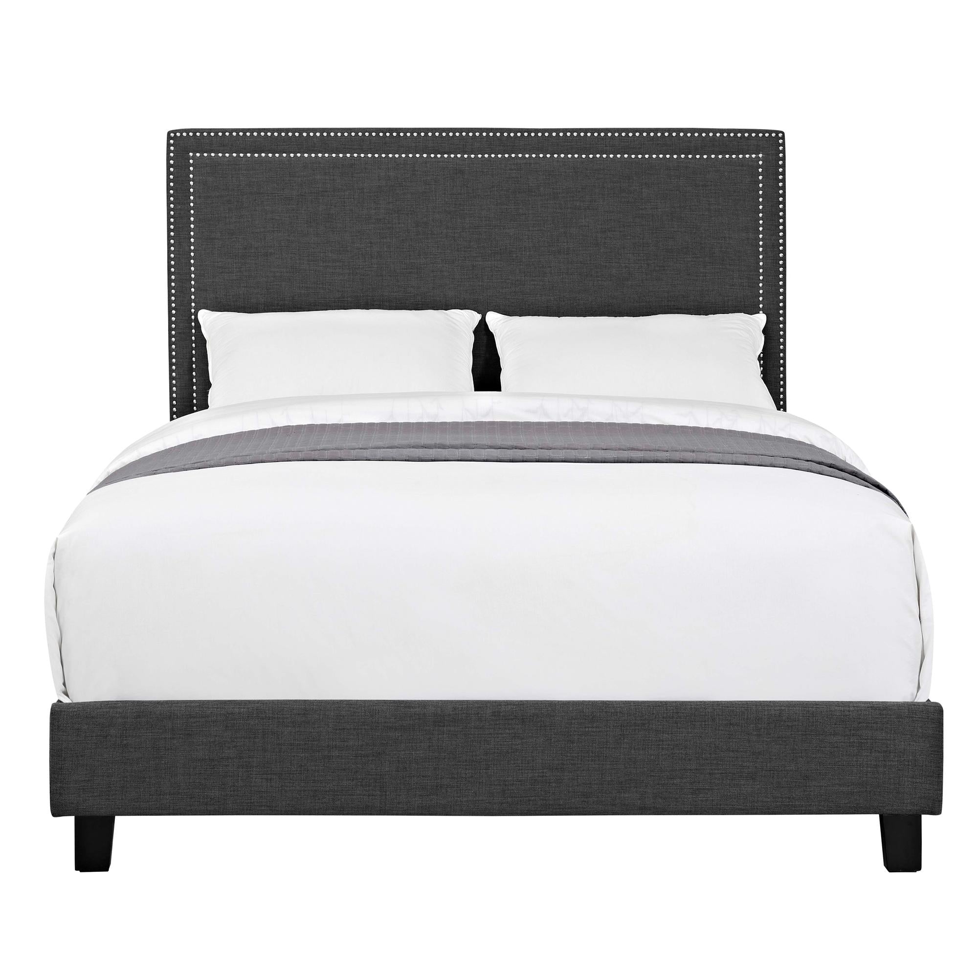 The Erica Upholstered Twin Platform Bed will instantly give your bedroom the update youve been craving! This stylish upholstered bed features chrome nail head trim along the headboard. No box spring required here, thanks to the euro slats! The euro slats offer a flexible foundation for your mattress. Keep it classic or mix it up, by pairing the Erica Bed with the Erica Chair for a complete look! - Upholstered Platform Bed - Euro Slats - Chrome Silver Nail Head Trim - Part of Emery Collection - Ships in One Box - Mattress Only Required - Straight Leg Feet Wood Frame: Eucalyptus/Plywood; Feet: Poplar Solid Wood; Cushion Filling: Foam; HB Leg Height: 21.65"; FB Leg Height: 4" 82 D x 43 W x 53 H, 73lbs. 1 Year Limited Manufacturer Warranty