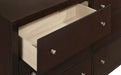 Classic sophistication meets everyday function in this dresser and mirror set. The six-drawer dresser showcases a rich cappuccino finish with brushed silver hardware and wide, smooth-gliding drawers for ample storage. Above, a matching rectangular mirror adds light and space with its leatherette-padded frame detail. Together, they create a cohesive centerpiece for your bedroom, blending traditional elegance with modern comfort and built from durable rubberwood and veneer construction. Key Features: • Six-drawer dresser paired with a matching padded frame mirror • Cappuccino finish enhances warmth and transitional character • Brushed silver hardware provides contrast and modern appeal • Spacious drawers offer organized storage for bedroom essentials • Mirror adds brightness and depth with its generous size • Crafted from rubberwood, veneer, and engineered wood for strength